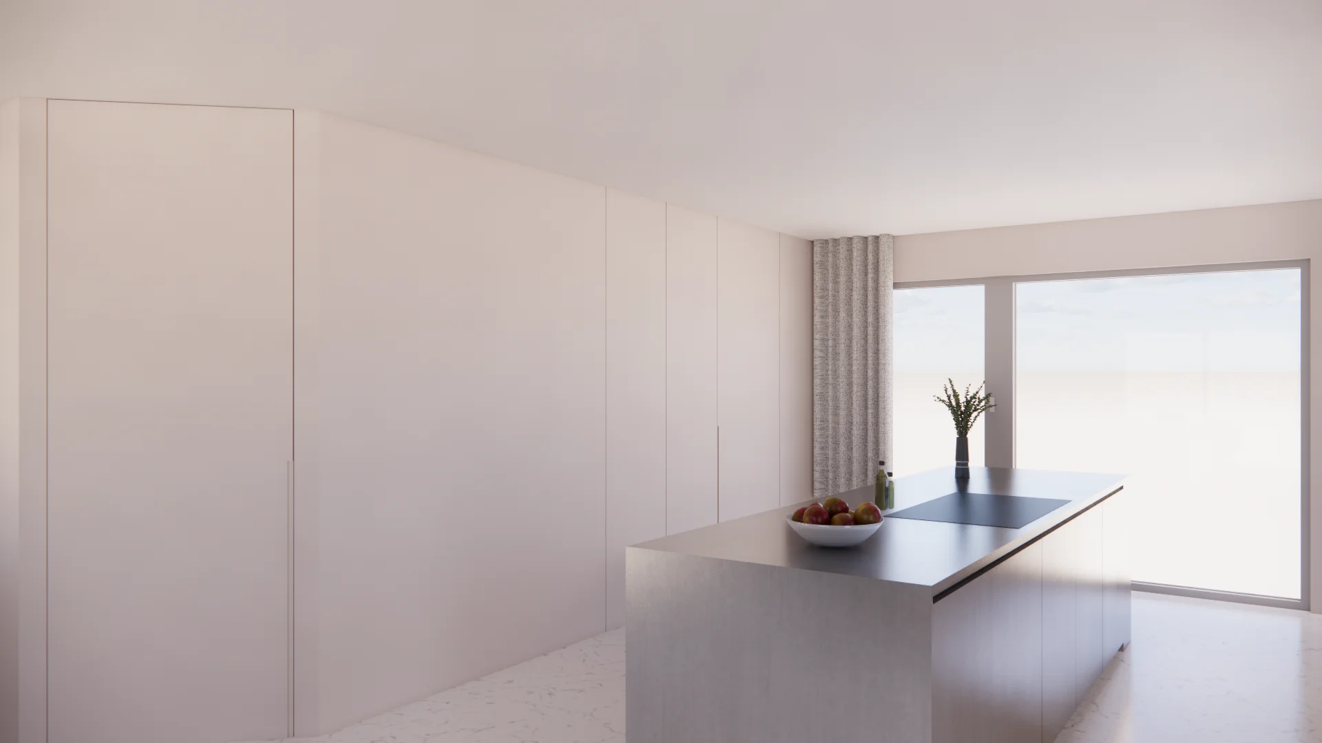 De renovatie van het gelijkvloers richtte zich op slimme indeling en maatwerk. Zo loopt de maatwerkkeuken naadloos over in een dressoir in de woonkamer, waardoor een gevoel van openheid ontstaat. Het keukeneiland in Fenix met geborstelde alu-look reflecteert het licht en versterkt de luchtige uitstraling, terwijl de wand met toestellen in een nis in de muur werd weggewerkt om kostbare vierkante meters te winnen.